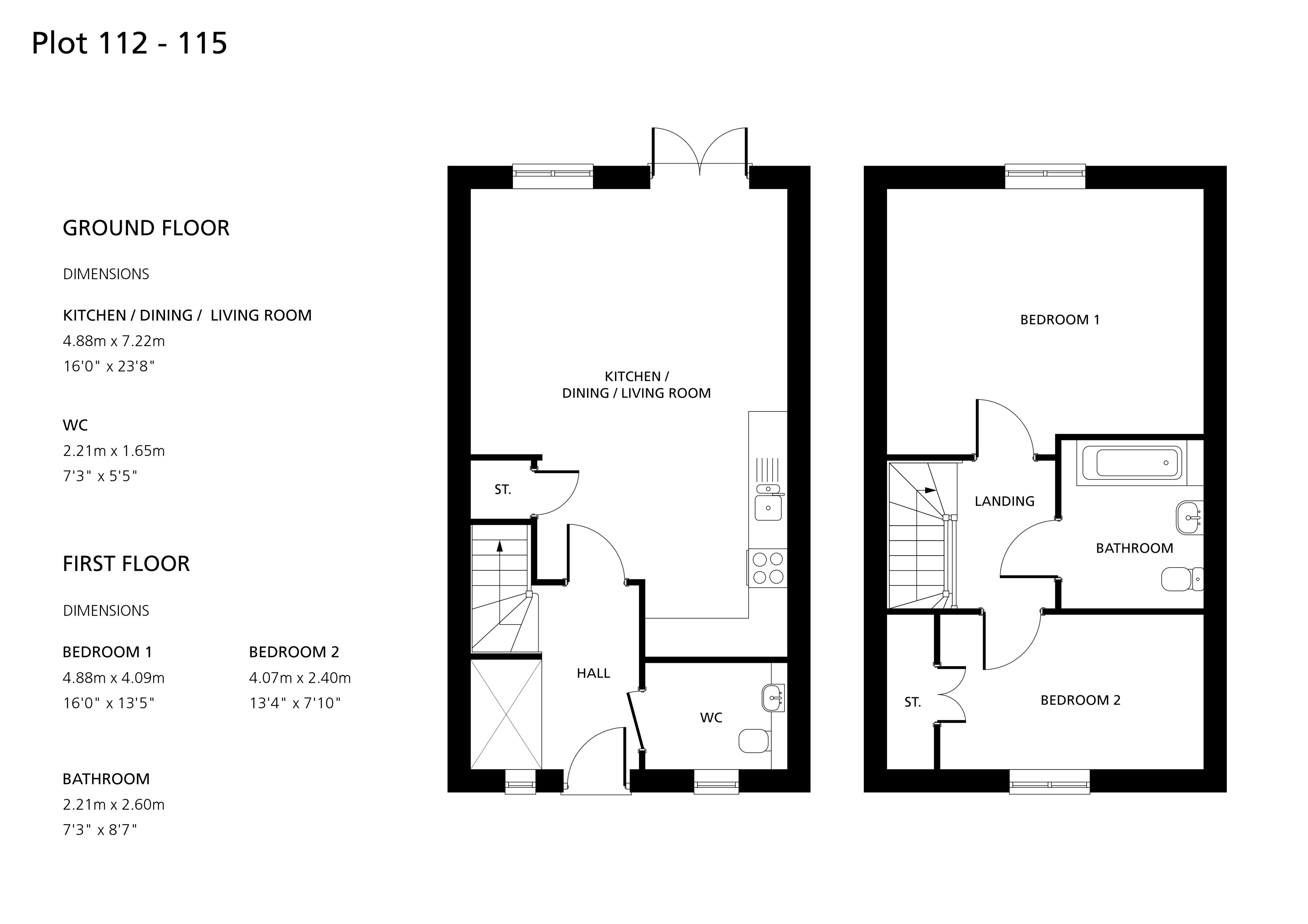 These two bedroom houses comprise of open plan living/dining/kitchen area, hallway and downstairs wc, family bathroom and two bedrooms.