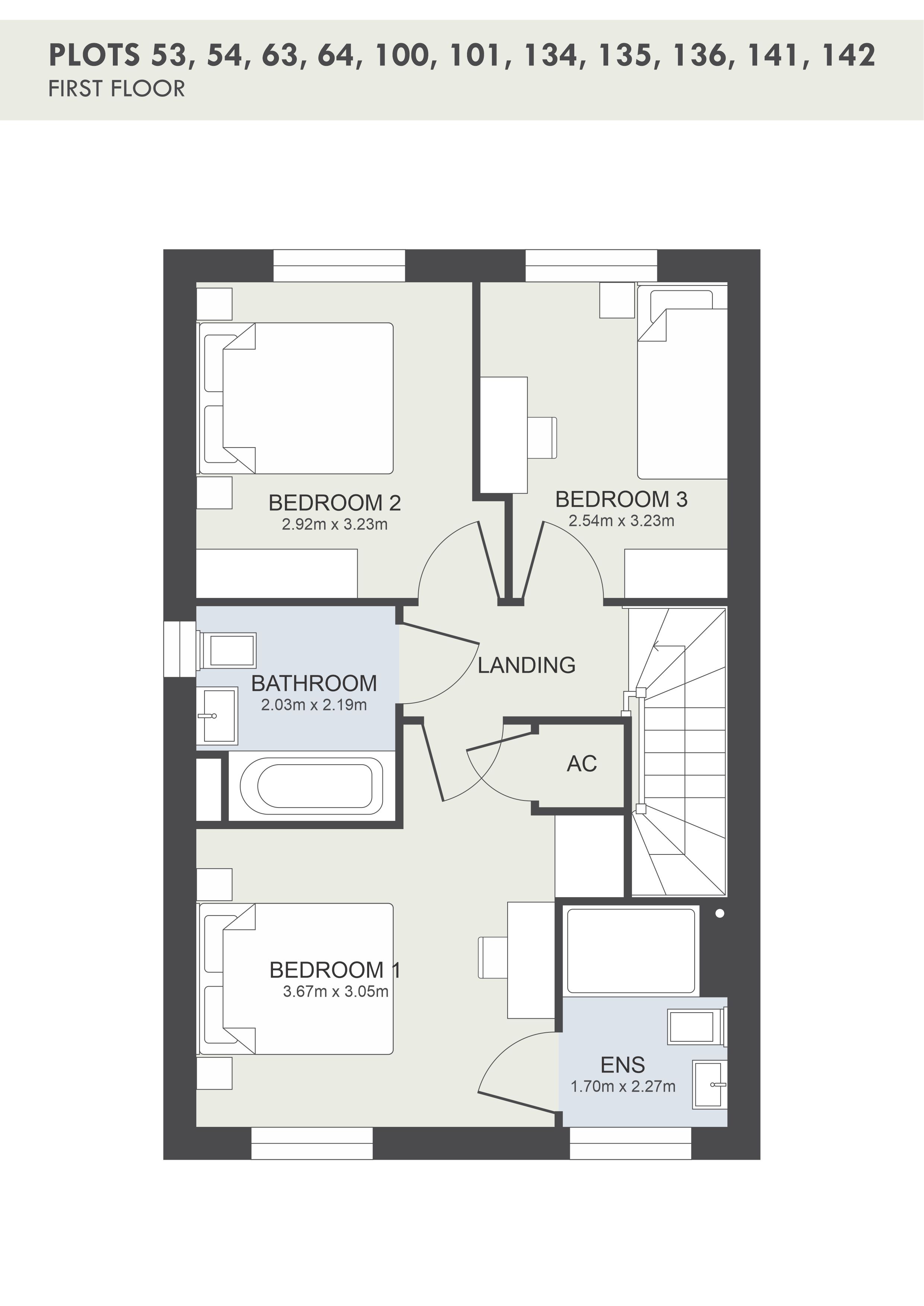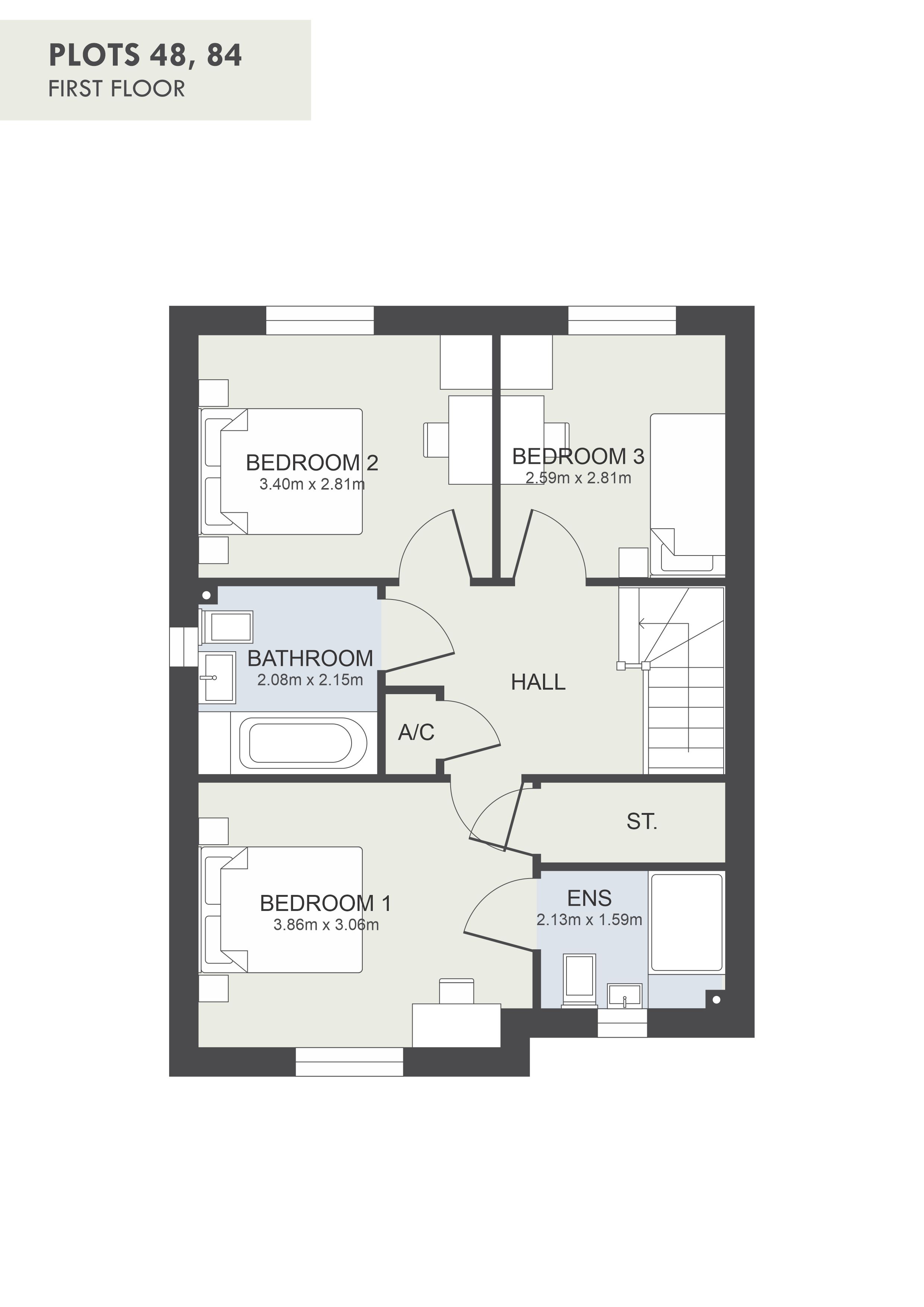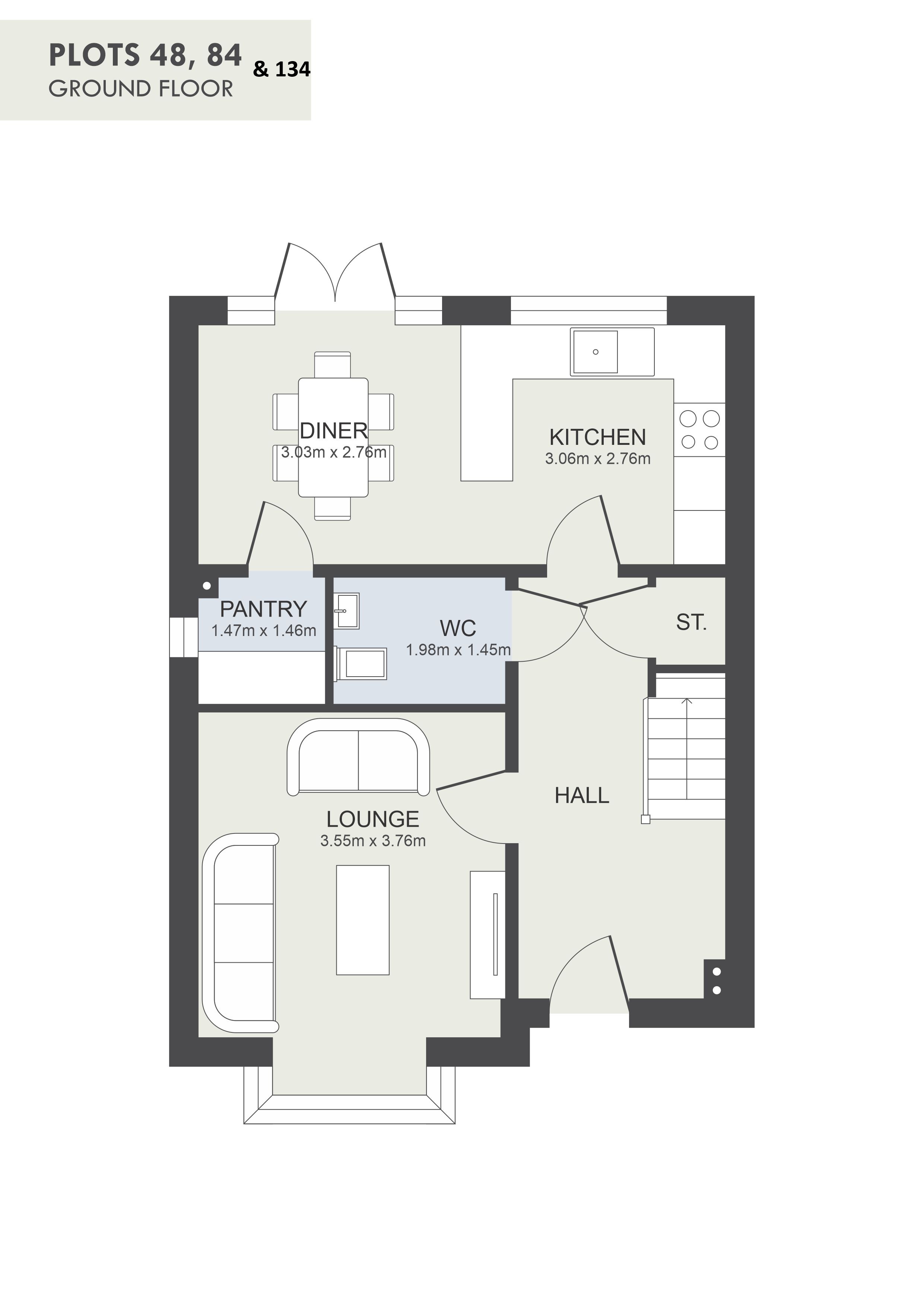 The Elm - Our detached three bedroom home with approximate floor space of 94m2. Entrance hall leads to lounge front of property with large bay window, cloakroom, and kitchen/diner offering access to separate pantry. Stairs lead to three bedrooms, master bedroom with ensuite, a further double bedroom and a single bedroom, and family bathroom with shower over bath.